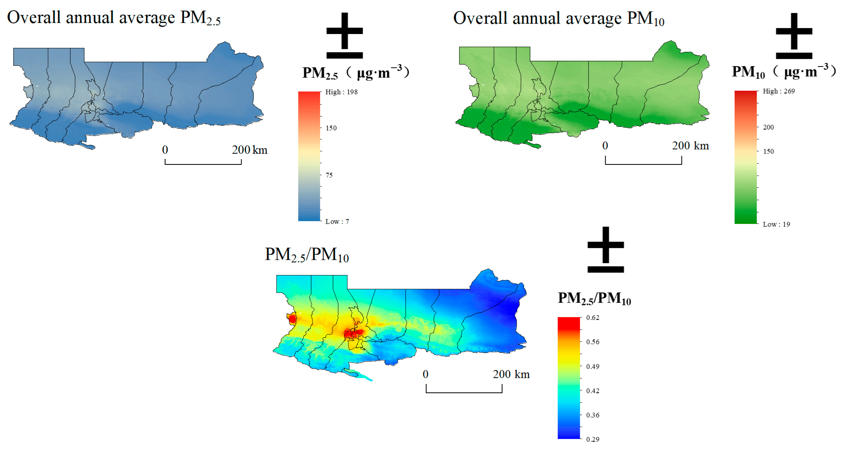 5.1. Annual Spatiotemporal Distribution Changes of PM2.5 and PM10
