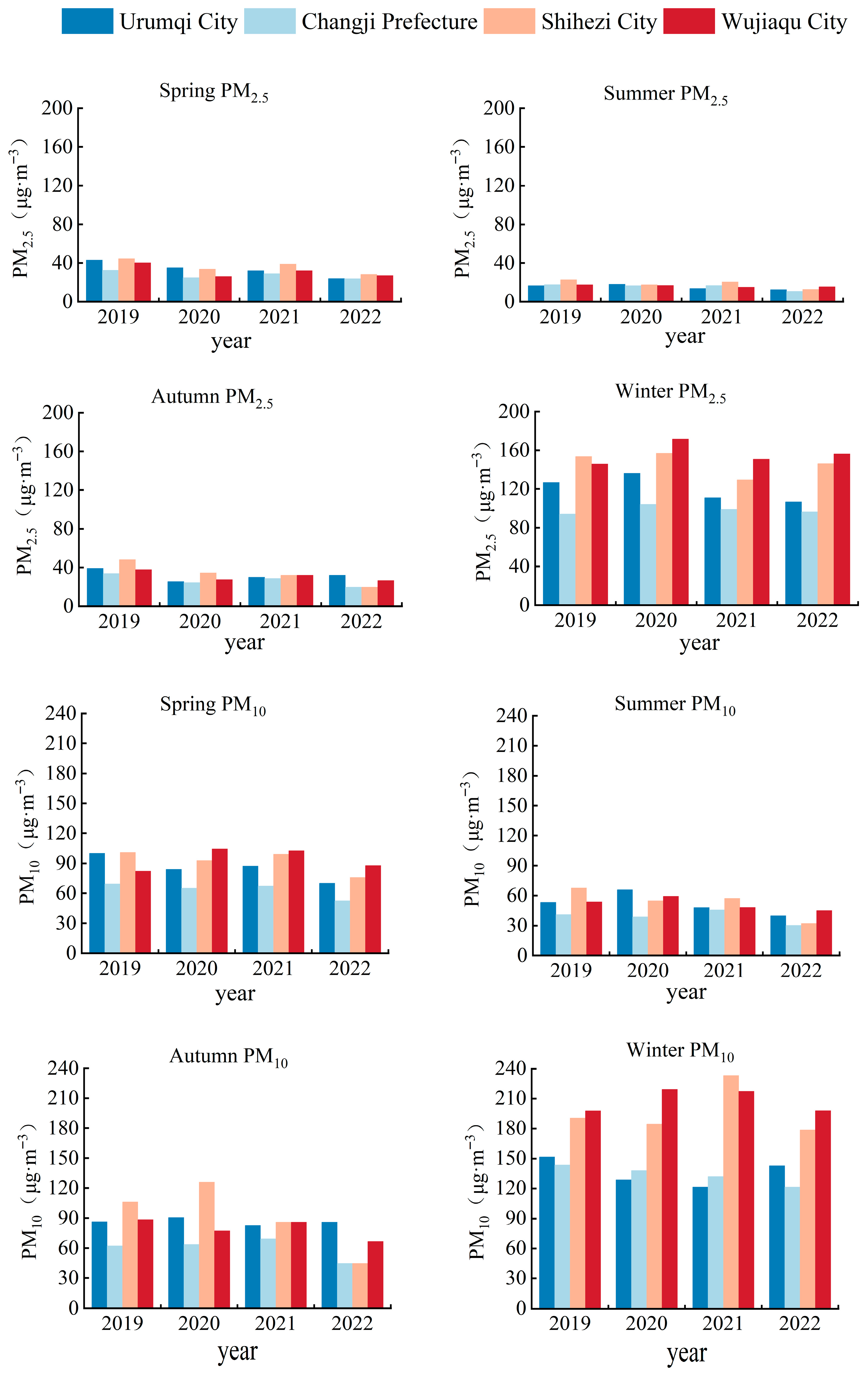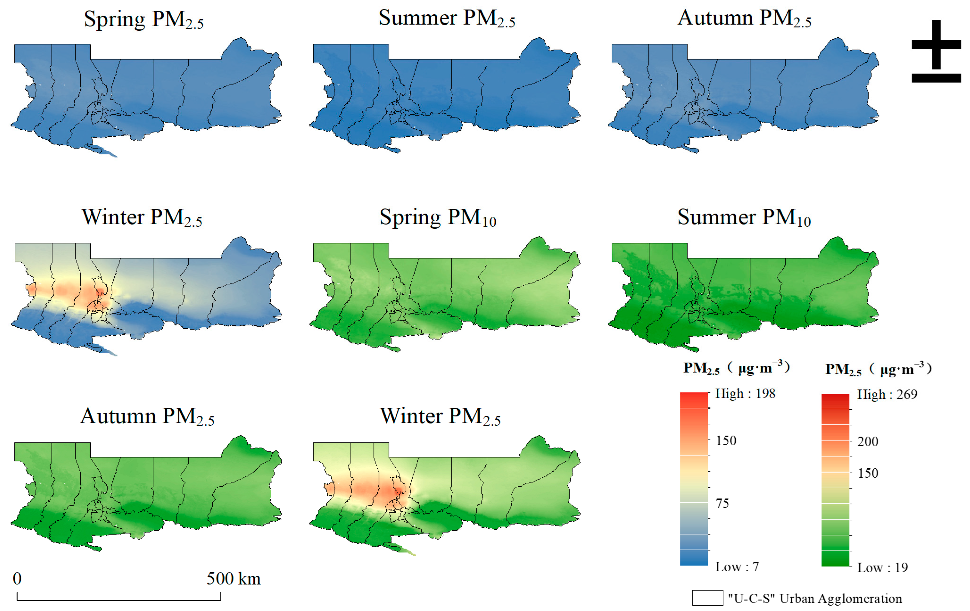 5.2. Seasonal Spatiotemporal Distribution Changes of PM2.5 and PM10