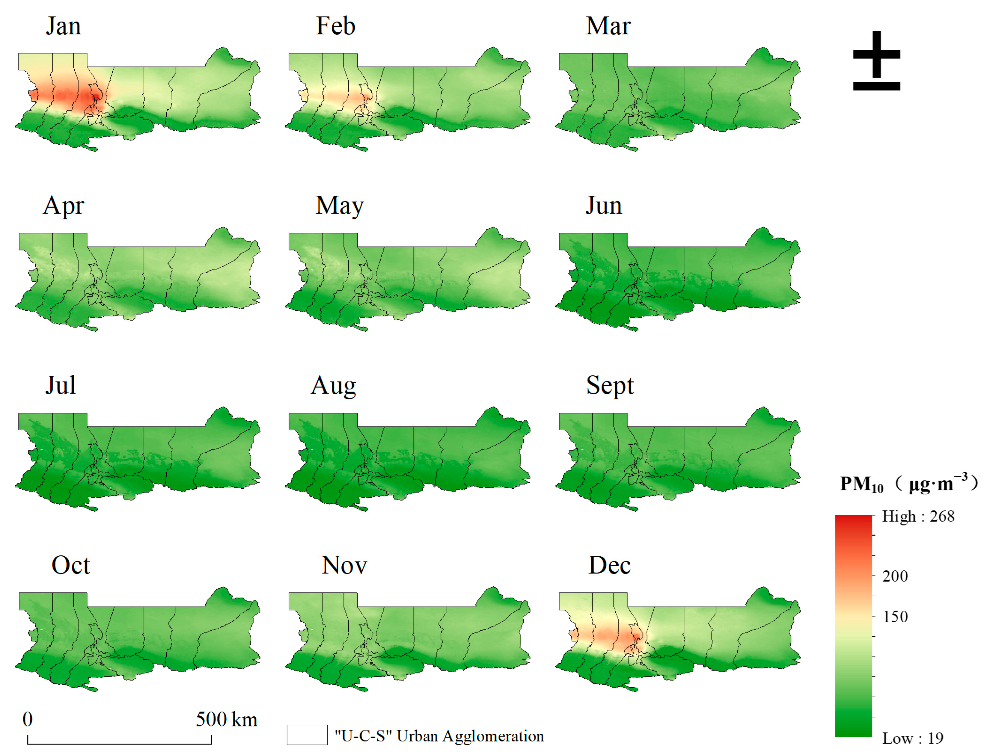 5.3. Monthly Spatiotemporal Distribution Changes of PM2.5 and PM10