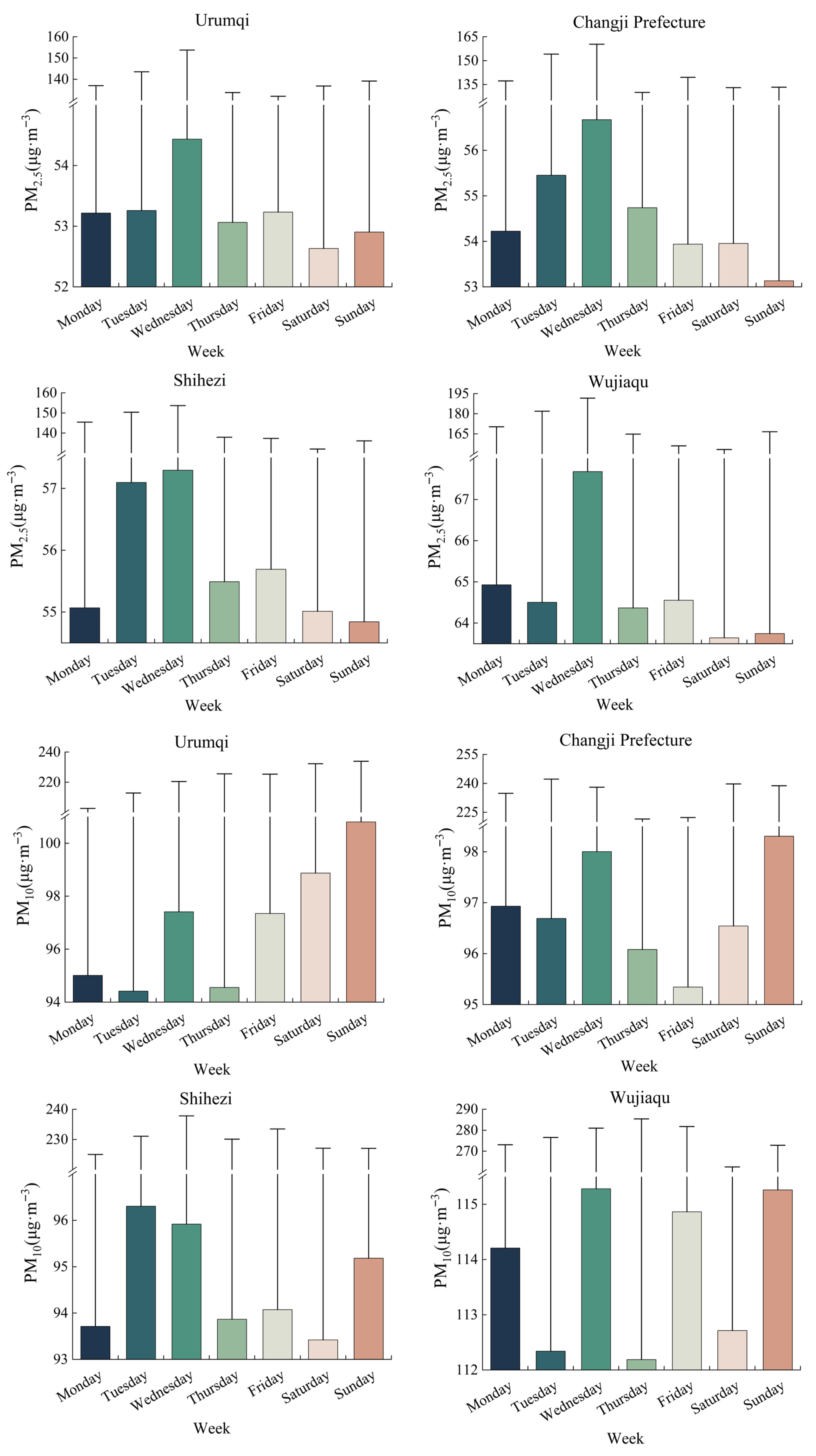 - Fan, S.; Liu, N.; Zhang, F. Analysis of the “Weekend Effect” characteristics and trend of air pollution in Urumqi. Xinjiang Environ. Prot. 2021, 43, 1–7. [Google Scholar]