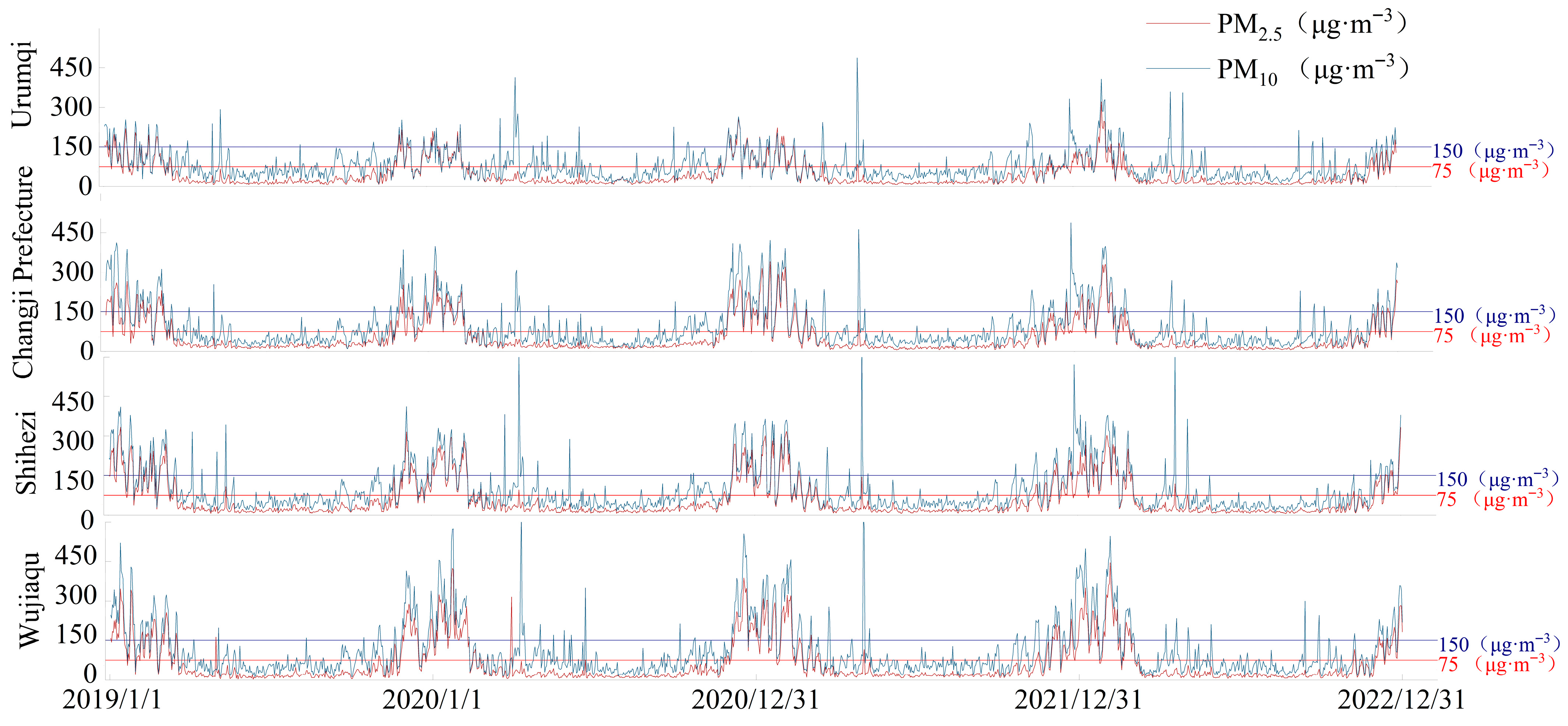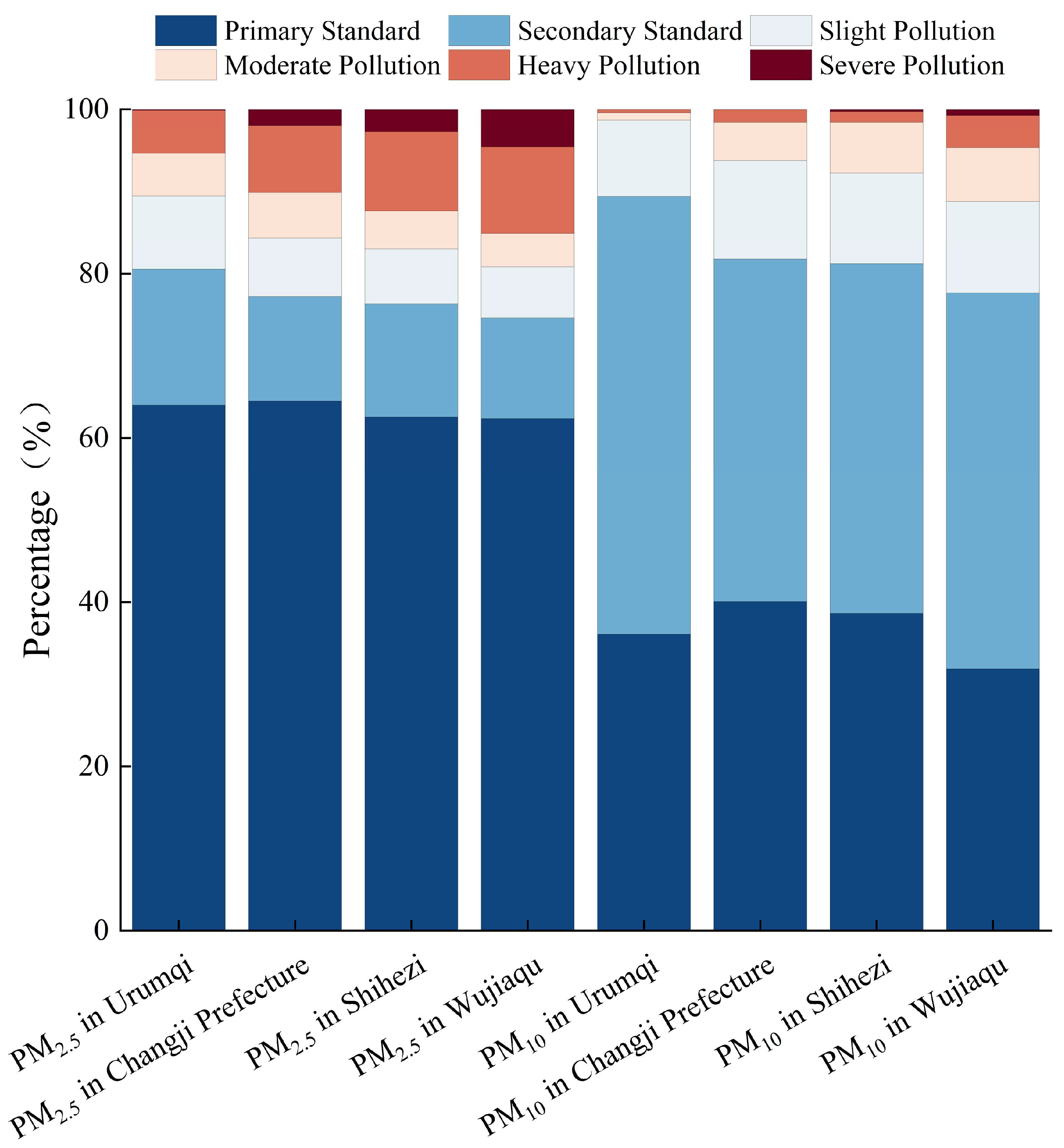 - Li, S.; Li, X.; Ayiken, M.; Zhong, Y.; Wang, H. Characteristics of air pollution and its polluted weather types of urban agglomeration on the north slope of the middle Tianshan Mountains from 2017 to 2019. Arid Land Geogr. 2022, 45, 1082–1092. [Google Scholar]