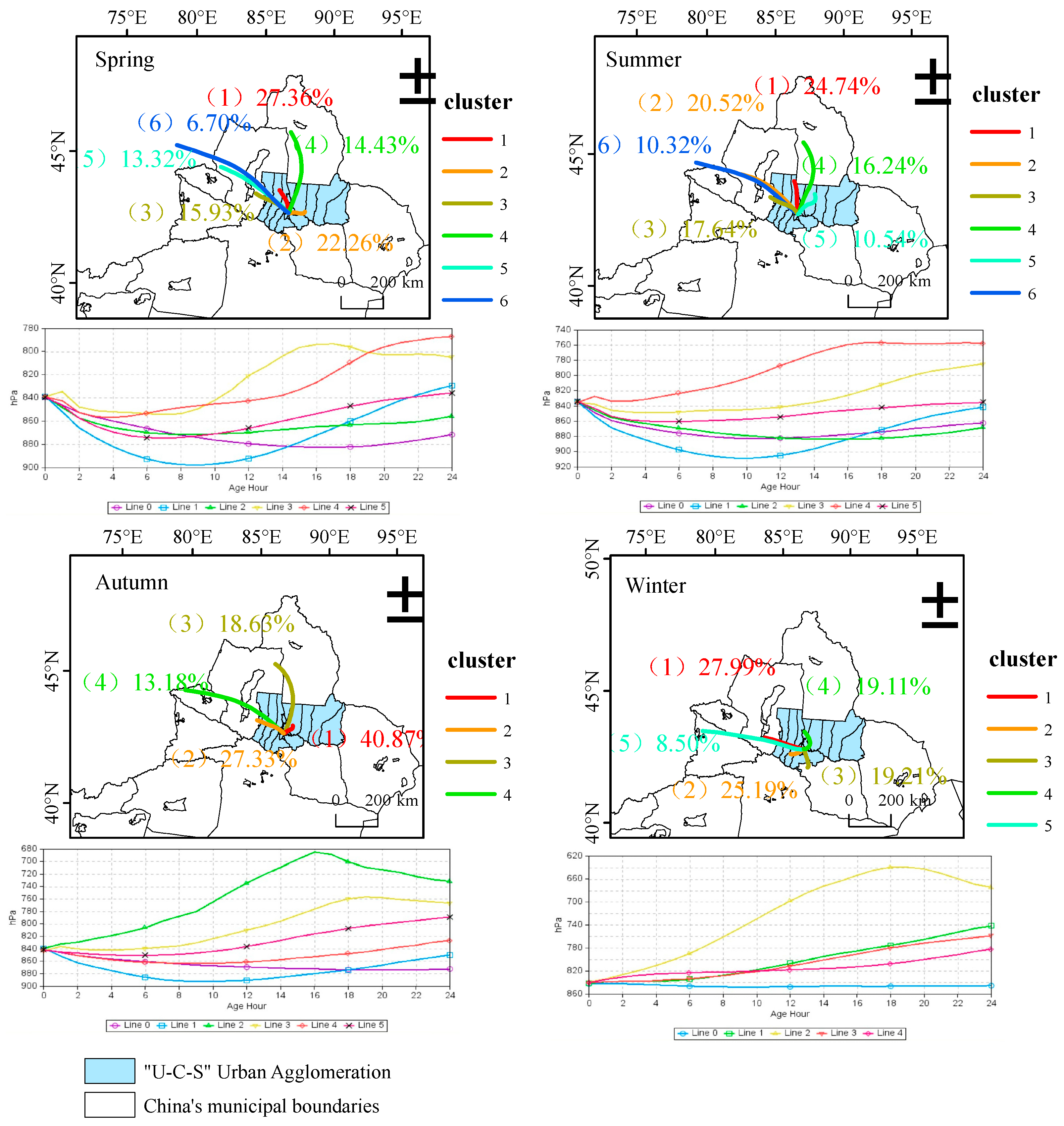 | Season | Clusters | The Number of All Trajectories | The Percentage of All Trajectories(%) | The Source Area of Air Masses | Mean Concentrations and Standard Deviation of PM2.5(μg·m−3) | Mean Concentrations and Standard Deviation of PM10(μg·m−3) |