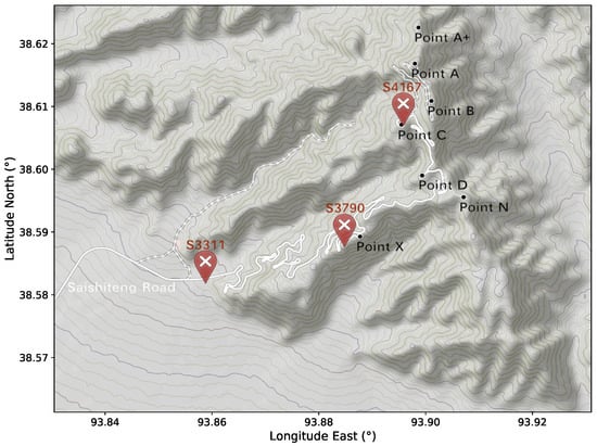 In recent years, three DZZ4-type automatic weather stations have been installed at elevations of 3311 m, 3790 m, and 4167 m on Saishiteng Mountain, designated as S3311, S3790, and S4167, respectively. These stations are situated at different altitudes, as indicated by the red markers in Figure 2. Black dots represent the locations of major observational platforms on Saishiteng Mountain, the white line denotes the road leading to the summit, and the background shows the topographic contour map (https://www.openstreetmap.org/, accessed on 20 June 2025) of the Lenghu site. The S3311 station is located at the base of the mountain, S3790 is positioned near Point X at mid-altitude, and S4167 is located adjacent to Point C. Table 1 summarizes the geographic coordinates and data acquisition details of the three stations. The data span from 2020 May to 2024 December and have a temporal resolution of 1 h. Through continuous and systematic monitoring of the vertical meteorological structure at the Lenghu site, these high-altitude automatic weather stations offer indispensable data for assessing astronomical observing conditions at different elevation points.