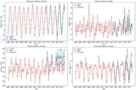 Monthly mean values of temperature, relative humidity, and atmospheric pressure, and wind speed recorded at Lenghu, Mahai, and Dafengshan stations from January 2005 to September 2017.