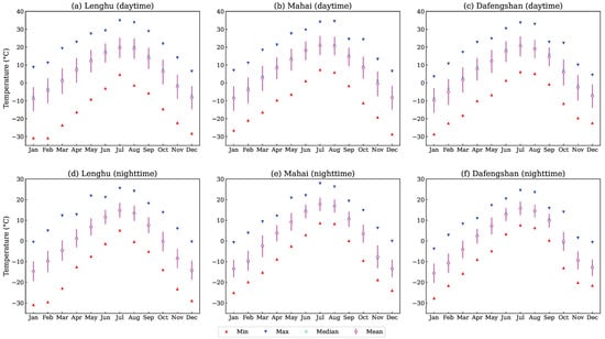 The temporal variations of the monthly median, maximum, and minimum temperatures during daytime and nighttime are shown in Figure 12. All three elevations exhibit consistent seasonal patterns, with the lowest temperatures occurring in winter (December–February) and the highest in summer (June–August). January reaches the seasonal minimum at the summit, with average temperatures of −14.0 C during the day and −15.4 C at night, and corresponding standard deviations of 4.6 and 4.3 C. The highest temperature are recorded at the mountain base in August, where daytime and nighttime mean temperatures reach 17.6 and 15.5 C, respectively. The corresponding standard deviations, 4.3 and 3.5 C. Across all months and altitudes, the maximum, minimum, mean, and median temperatures show a consistent decline from the base to the summit during the daytime and nighttime.