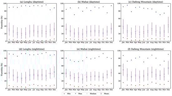 Monthly variation of relative humidity at Lenghu, Mahai, and Dafengshan stations during daytime (top) and nighttime (bottom).