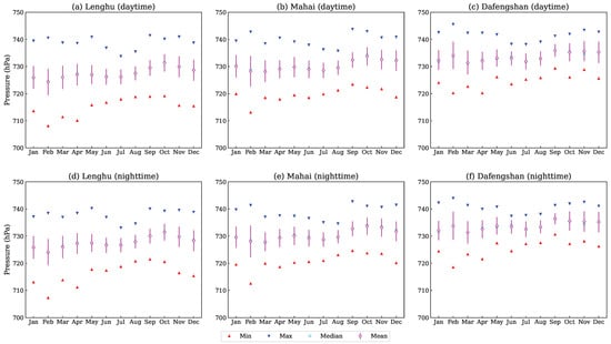 We calculate the monthly maximum, minimum, median, mean, and standard deviation of surface pressure during daytime and nighttime. The corresponding temporal variations are illustrated in Figure 6. The pressure trends are broadly consistent throughout the year, exhibiting only minor intermonthly variations. This indicates that the Lenghu region experiences a generally stable atmospheric pressure regime. Such stability also implies that other meteorological variables associated with pressure, such as temperature, wind speed, and weather conditions, are likely to remain relatively steady as well. In February, pressure variations reach their annual maximum, and Dafengshan Station shows a trend opposite to that of Lenghu and Mahai, which suggests enhanced regional meteorological activity during this period. In contrast, pressure values are most stable in August. Moreover, nighttime pressure tends to be more stable than daytime pressure, which indicates more favorable atmospheric conditions for astronomical observations during nighttime hours.