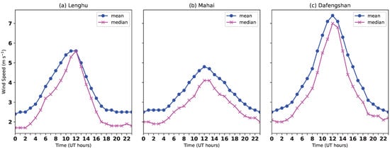 Figure 7 presents the daily cycle of wind speed based on hourly mean and median values at the Lenghu, Mahai, and Dafengshan stations. The wind speed exhibits a pronounced and symmetric temporal pattern across all three stations. Wind speed begins to increase around 10:00 local time (UT = 2 h), peaks at approximately 20:00 (UT = 12 h) after sunset, and subsequently declines through the night. While the trends of wind speed are consistent among the stations, notable differences are observed in the peak speed and rates of speed change. At Dafengshan, the mean wind speed exceeds 7 m s−1, whereas it remains below 5 m s−1 at Mahai.