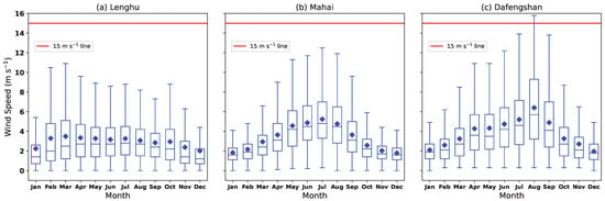 Boxplot of monthly wind speed at Lenghu, Mahai, and Dafengshan stations during nighttime. Each box represents values in the range of 25 to 75% and vertical lines mark the values 1 to 99%. The diamonds and horizontal lines inside every box signify mean and median values, respectively. The red line represents the upper limit of 15 m s−1.