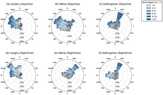 A wind rose reflects the frequency distribution of wind directions and the corresponding wind-speed characteristics in a specific region. Figure 9 presents the wind rose diagrams for daytime and nighttime at the three stations. It is evident that the wind directions at Lenghu and Dafengshan stations remain generally consistent throughout the day and night, whereas Mahai station exhibits a distinct shift in prevailing wind direction. At Lenghu station, winds predominantly originate from the northwest (NW). Dafengshan station is primarily influenced by winds from the north-northeast (NNE), with higher wind speeds than in other directions. Mahai experiences west-northwesterly (WNW) winds during the day, shifting to northeasterly (NE) at night. At all stations, wind speeds are primarily concentrated in the 2 to 6 m s−1 range, with gusts exceeding 8 m s−1 occurring from multiple directions.