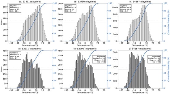 Histograms and cumulative distributions of temperature at S3311, S3790, and S4167 during daytime (top) and nighttime (bottom). Solid blue line: cumulative probability; dashed gray line: 50% probability level.
