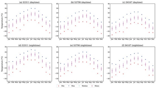 Monthly statistics of air temperature at S3311, S3790, and S4167 during daytime (top) and nighttime (bottom).