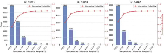The variation in nighttime temperature is a key indicator of atmospheric stability and directly influences both instrument performance and observational accuracy [24]. Accordingly, we analyzed the hourly fluctuations in nighttime temperature. The statistical results show that most hourly changes fall within 0–1 C, with more than 90% of the data at the mid-slope and summit stations lying in this range (Figure 13). The high nighttime temperature stability offers favorable conditions for astronomical observations at the Saishiteng Mountains.