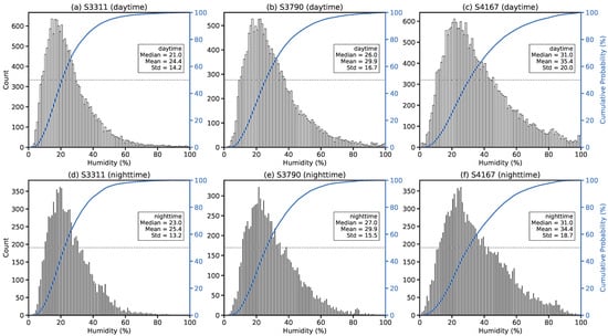 The daytime and nighttime distributions of relative humidity are represented by histograms and cumulative distributions in Figure 14. The median, mean, and standard deviation of relative humidity during both daytime and nighttime increase with elevation. For instance, the median relative humidity rises from 21% during the day to 23% at night. The corresponding values are 26% and 27% at S3790, while both daytime and nighttime medians reach 31% at S4167. Higher elevations thus exhibit greater humidity and larger statistical dispersion. The cumulative distribution curves further support this trend, showing a slower rise at higher altitudes, which indicates a larger fraction of samples at higher humidity levels. Moreover, the difference between daytime and nighttime relative humidity decreases with elevation.