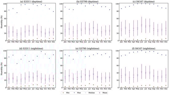 Monthly statistics of relative humidity at S3311, S3790, and S4167 during daytime (top) and nighttime (bottom).