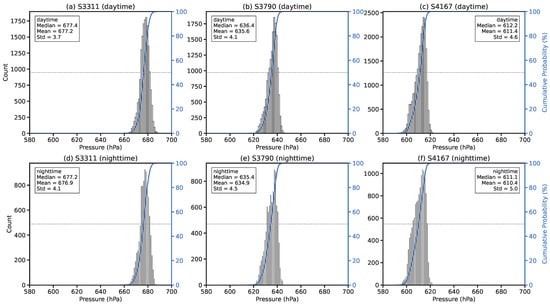 We statistically analyzed the pressure distributions to investigate the pressure characteristics at different elevations on Saisheteng Mountain. Figure 16 presents the histograms and corresponding cumulative distribution curves of barometric pressure for daytime (top) and nighttime (bottom). The nighttime median pressures are 677.2 hPa, 635.4 hPa, and 611.1 hPa, respectively. Daytime pressures are about 1 hPa higher than nighttime values, and the standard deviations at the three sites range from 3.7 hPa to 5.0 hPa.