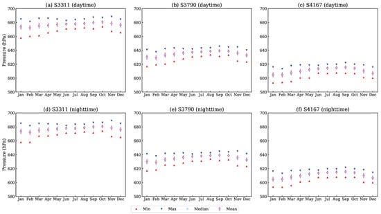 Monthly statistics of air pressure at S3311, S3790, and S4167 during daytime (top) and nighttime (bottom).