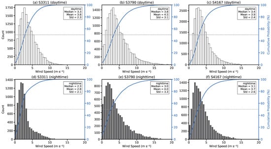 We plot the histograms and cumulative distribution curves of daytime and nighttime wind speeds in Figure 18. Statistical results indicate that nighttime wind speeds are slightly lower than those during the day, with a median value of about 3 m s−1, which helps to maintain good nighttime seeing conditions. As elevation increases, the mean and median wind speeds increase to a peak at station S3790 before declining at S4167. Extreme wind events exceeding 15 m s−1 are rare and have only been recorded at S3790, likely due to localized strong airflow generated by the valley topography in this area. The recorded maximum nighttime wind speeds are 14.9 m s−1, 23.8 m s−1, and 21 m s−1 at S3311, S3790, and S4167, respectively. This indicates that strong winds must be accounted for during telescope construction and operation, and protective measures are particularly important at mid-mountain sites.