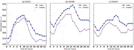 Mean and median values of hourly wind speed at S3311, S3790, and S4167.