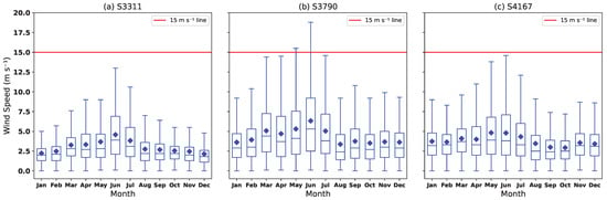 Boxplot of monthly wind speed at S3311, S3790, and S4167 during nighttime. Each box represents values in the range of 25 to 75% and vertical lines mark the values 1 to 99%. The diamonds and horizontal lines inside every box signify mean and median values, respectively. The red line represents the upper limit of 15 m s−1.