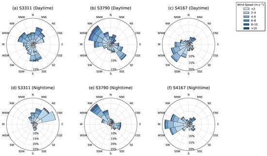 Wind rose density at S3311, S3790, and S4167 during daytime (top) and nighttime (bottom).