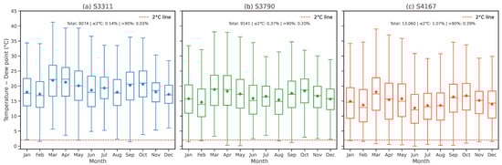 We statistically analyzed the overall characteristics of daytime and nighttime relative humidity, as well as the occurrence probability of high-humidity events. At S3311, a total of 25,454 data points were recorded, among which 43 instances (0.17%) exceeded the relative humidity 90% threshold. Notably, only 0.03% of the nighttime data surpassed this limit. At S3790, 131 of 25,600 measurements (0.51%) exceeded the threshold, of which only 0.2% occurred at night. At S4167, 358 out of 37,098 records (0.97%) exceeded the relative humidity threshold, with 0.39% occurring at night. These results indicate that high-humidity events are rare at the site, and their occurrence frequency increases slightly with elevation.