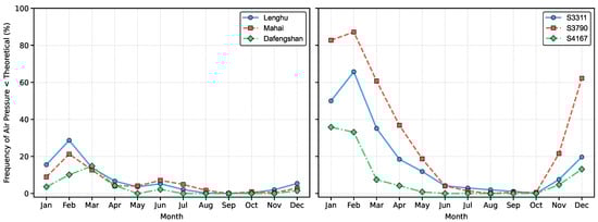 Monthly statistics of air pressure at Lenghu, Mahai, and Dafengshan stations during daytime (top) and nighttime (bottom).