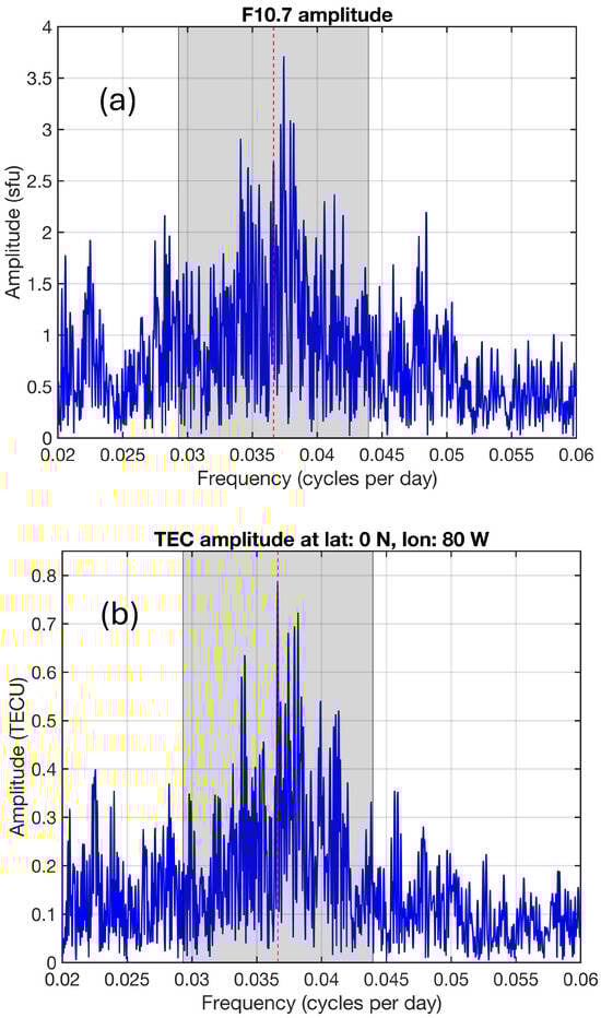 FFT amplitude spectra: broad spectral peaks of the 27-day oscillation in (a) solar radio flux at 10.7 cm (F10.7) and (b) TEC above Ecuador (0° N, 80° W) for the time interval July 1998 to October 2024. The shaded region shows the selected band pass width with a central period of 27.3 days (vertical red dashed line).