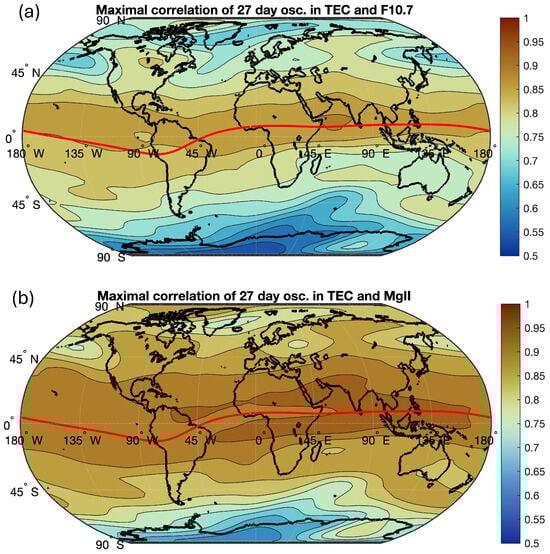 Maximal correlation of the 27-day oscillations in TEC and F10.7 (a) and in TEC and the MgII index (b) for the time interval from March 2003 to February 2020. The red line indicates the geomagnetic equator.