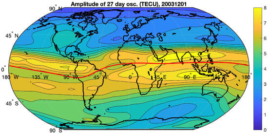 World map of the amplitude of the 27-day oscillation in TEC (average for November and December 2003) when the 27-day oscillation was strong. The red line indicates the geomagnetic equator.