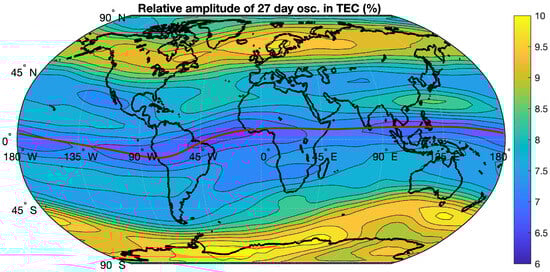 World map of the mean relative amplitude of the 27-day oscillation in TEC averaged for the time interval from 1998 to 2024 (with respect to mean TEC at latitude and longitude of the grid point). The red line indicates the geomagnetic equator.