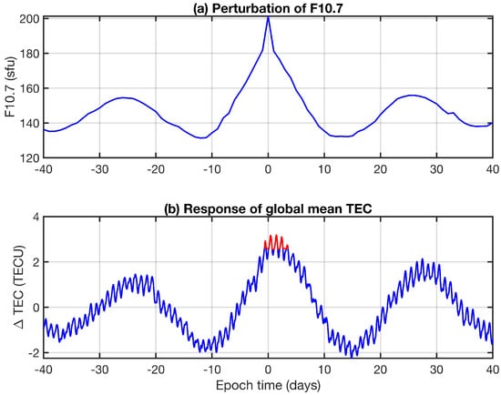The composite analysis of the TEC response with respect to strong enhancements in F10.7 is performed for 88 local maxima of F10.7, which are indicated by red dots in Figure 8. The time positions of the red dots are taken as timing marks for the epoch time in the composites of F10.7 and global mean TEC.