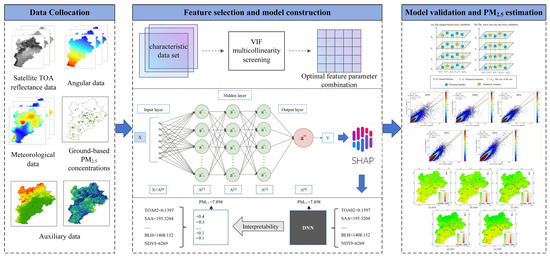 This study involves three steps (Figure 2). First, the required feature data were collected, preprocessed, and temporally and spatially aligned. Second, the VIF values of the feature parameters were calculated to identify and remove features with multicollinearity, and an annual optimal dataset of feature parameters was formed. Multicollinearity refers to the presence of linear relationships among independent variables [50]. The VIF can be used to assess the degree of multicollinearity among the predictors. Typically, when the VIF of a variable is greater than or equal to 10, strong multicollinearity is considered to exist [51], and the variable should be removed. Then, the PM2.5 estimation model was developed based on the annual optimal dataset. This study proposed a unique and interpretable PM2.5 estimation model by coupling the SHAP explainability method with a DNN. Finally, two evaluation methods were used to assess overall performance of the model. In addition, the BTH area’s PM2.5 concentrations from 2019 to 2023 were predicted.