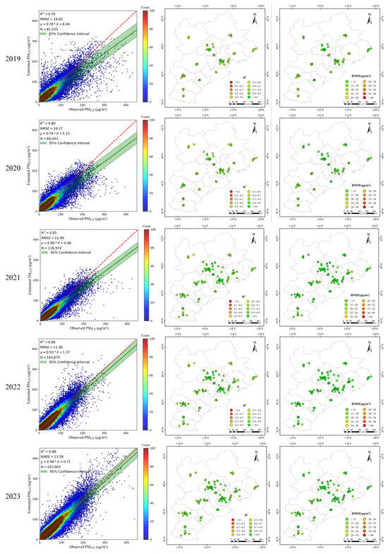 Figure 10. Fitting scatter plot of estimated and ground-monitored PM2.5 values from 2019 to 2023.
