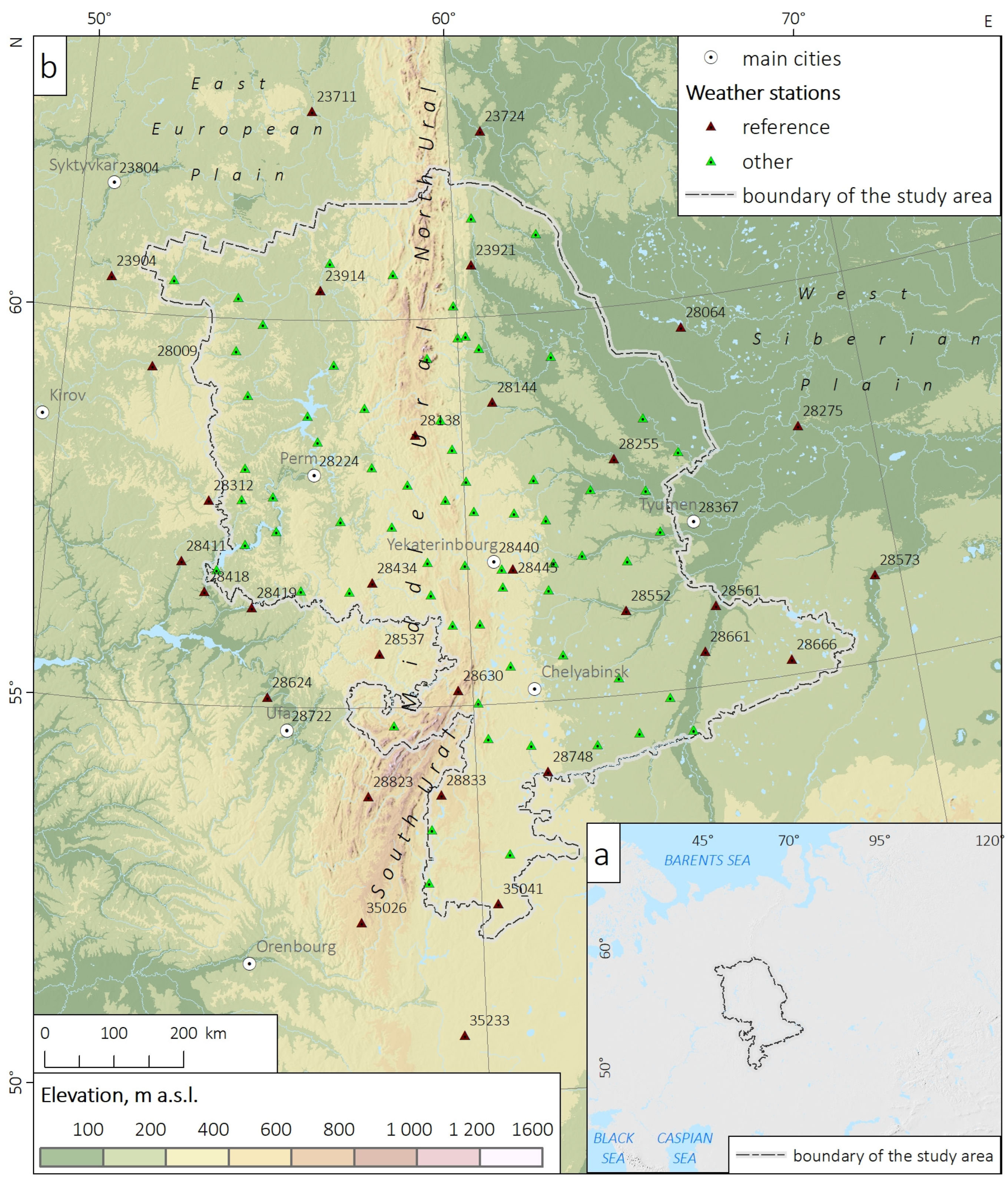 - The Ural Hydrometeorological Service. Yearly Weather Reports for the Period 1981–2024; The Ural Hydrometeorological Service: Yekaterinbourg, Russia, 2025. (In Russian)