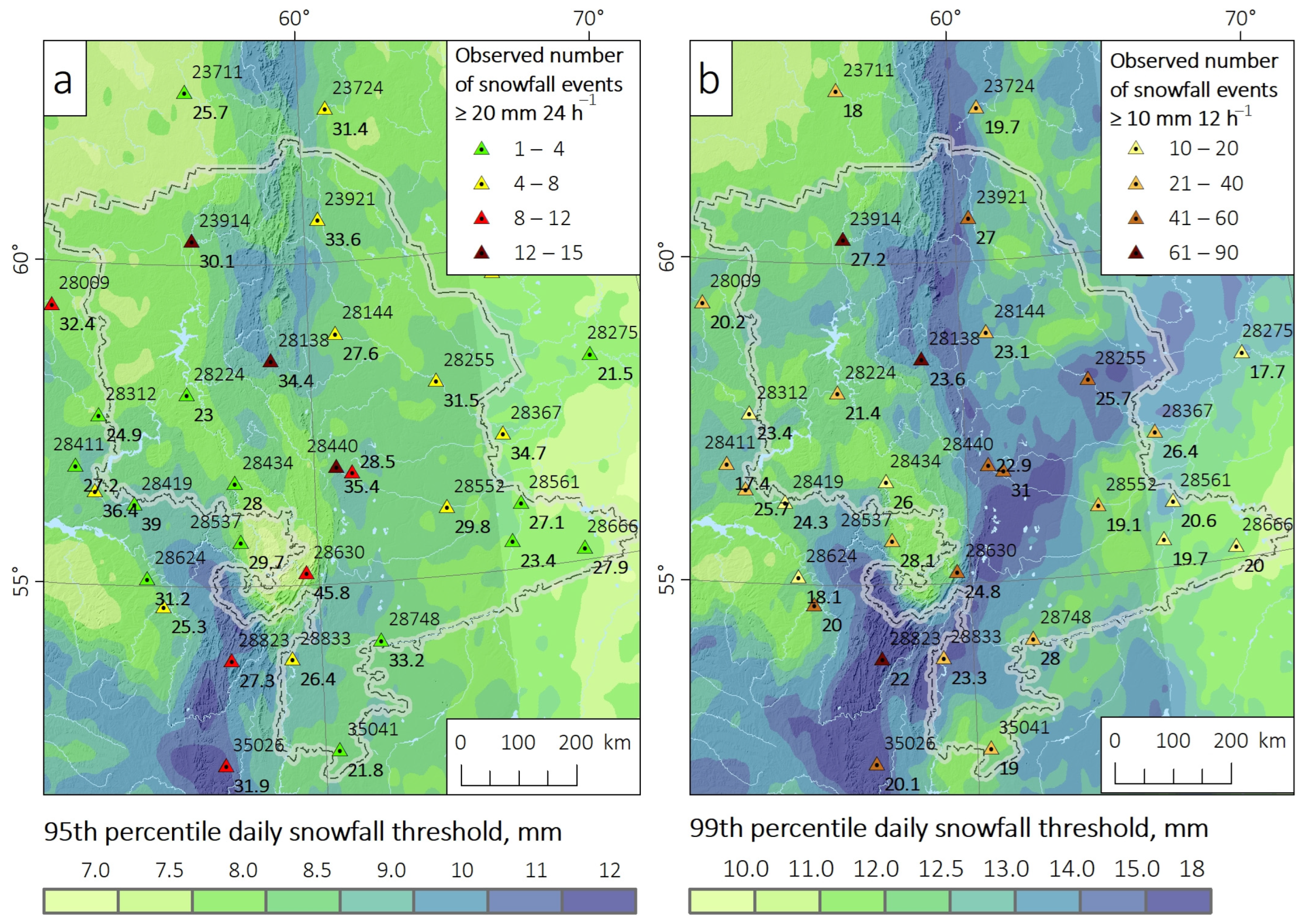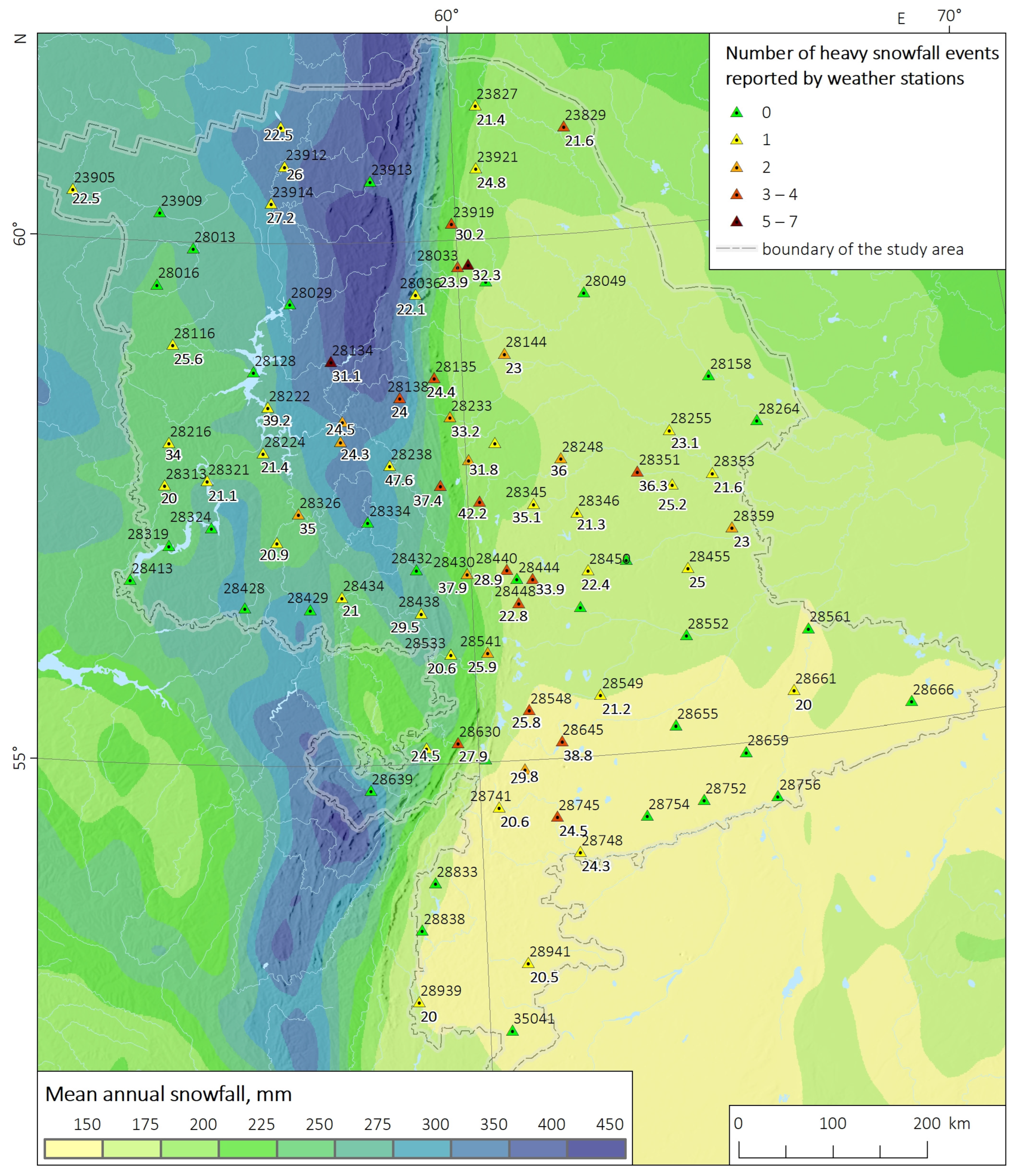 3.1. Climatology of Heavy Snowfall Events in the Ural Region