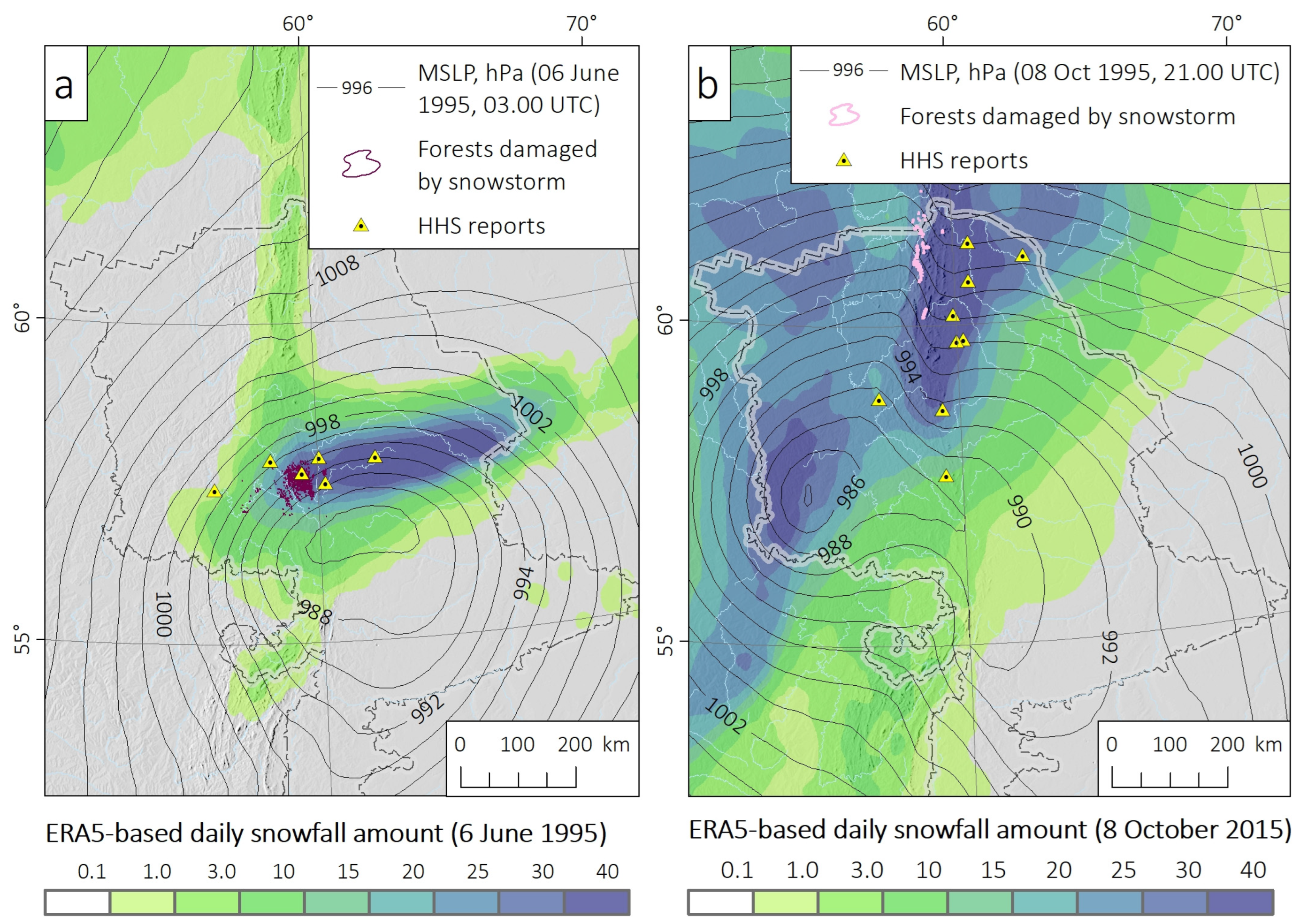 | Database of windthrow events in the forest zone of Russia [67] | − | Large-scale forest damage caused by heavy snowfall and wet snow accumulation |