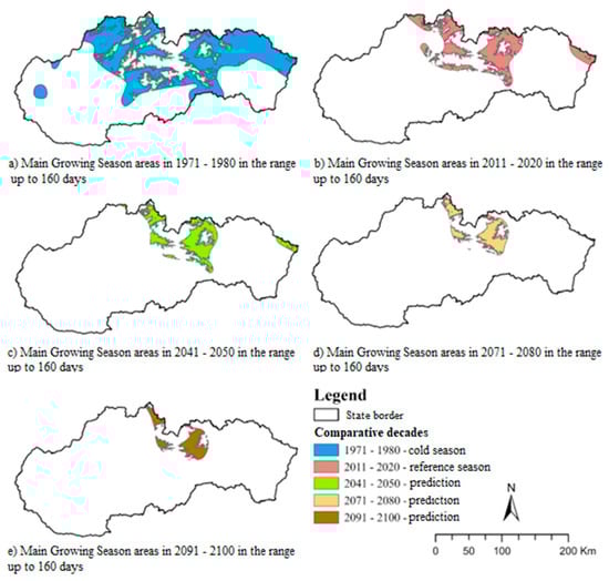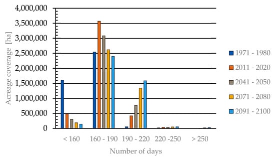 For the MGS, the individual decades have also been reclassified into five classes with 30-day intervals when the average temperature is above 10.0 °C. The design of these intervals was informed by a histogram, with the initial interval extending up to 160 days. The subsequent intervals are 160–190 days, 190–220 days, 220–250 days, and over 250 days. As demonstrated in Figure 5, in the past, the period of up to 160 days occurred over a more extensive area than at present. The area in question encompasses 1,600,000 hectares, constituting 38.0% of the total area. It is evident that periods exceeding 250 days are no longer evident during the cold season; however, for other periods, they are capable of covering an area of approximately 30,000 hectares. The 160–190-day interval is characterised by the most extensive areal extent of all the decades. It is anticipated that the MGS will encompass an area of approximately 2,500,000–3,500,000 ha over this span. This interval is responsible for covering 60–70% of the area.