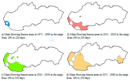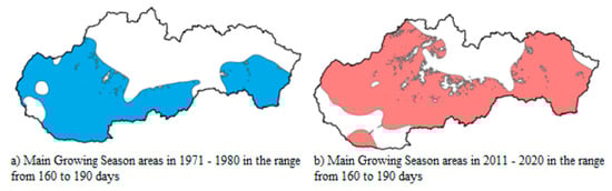The projected climate change in Slovakia is expected to have a significant impact on temperature and moisture conditions in agricultural production, as well as on phenological patterns and soil properties. These alterations have the potential to diminish crop yields in regions experiencing summer heat, augment soil evaporation, and elevate the probability of drought. The objective of this study was to evaluate and revise the spatial extent of vegetation zones and agricultural land. A detailed analysis of the past 30 years revealed that the growing season has become both earlier in the year and later in the year in terms of its onset and cessation. Projections indicate that, by 2091–2100, the great growing season (GGS) will be 25–30 days longer and the main growing season (MGS) 20 days longer than at present. The results indicate that the extended growing seasons will encompass larger areas and gradually shift to higher altitudes. At present, the 220–240-day category of the GGS spatial domain is dominant (1.7–2.3 million hectares), while durations of the GGS exceeding 260 days, which were absent in the 1971–1980 period, are expected to increase the area of the growing season by approximately 55,000 hectares by 2100. For the MGS, the 160–190-day category remains prevalent (approximately 2.5 million hectares), with only moderate future increases of up to 220 days being expected. It is anticipated that extended durations will remain constrained, encompassing less than 50,000 hectares.