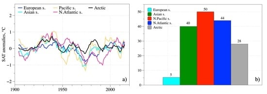 - Svendsen, L.; Keenlyside, N.; Bethke, I.; Gao, Y.; Omrani, N.E. Pacific contribution to the early twentieth-century warming in the Arctic. Nat. Clim. Change 2018, 8, 793–797. [Google Scholar] [CrossRef]