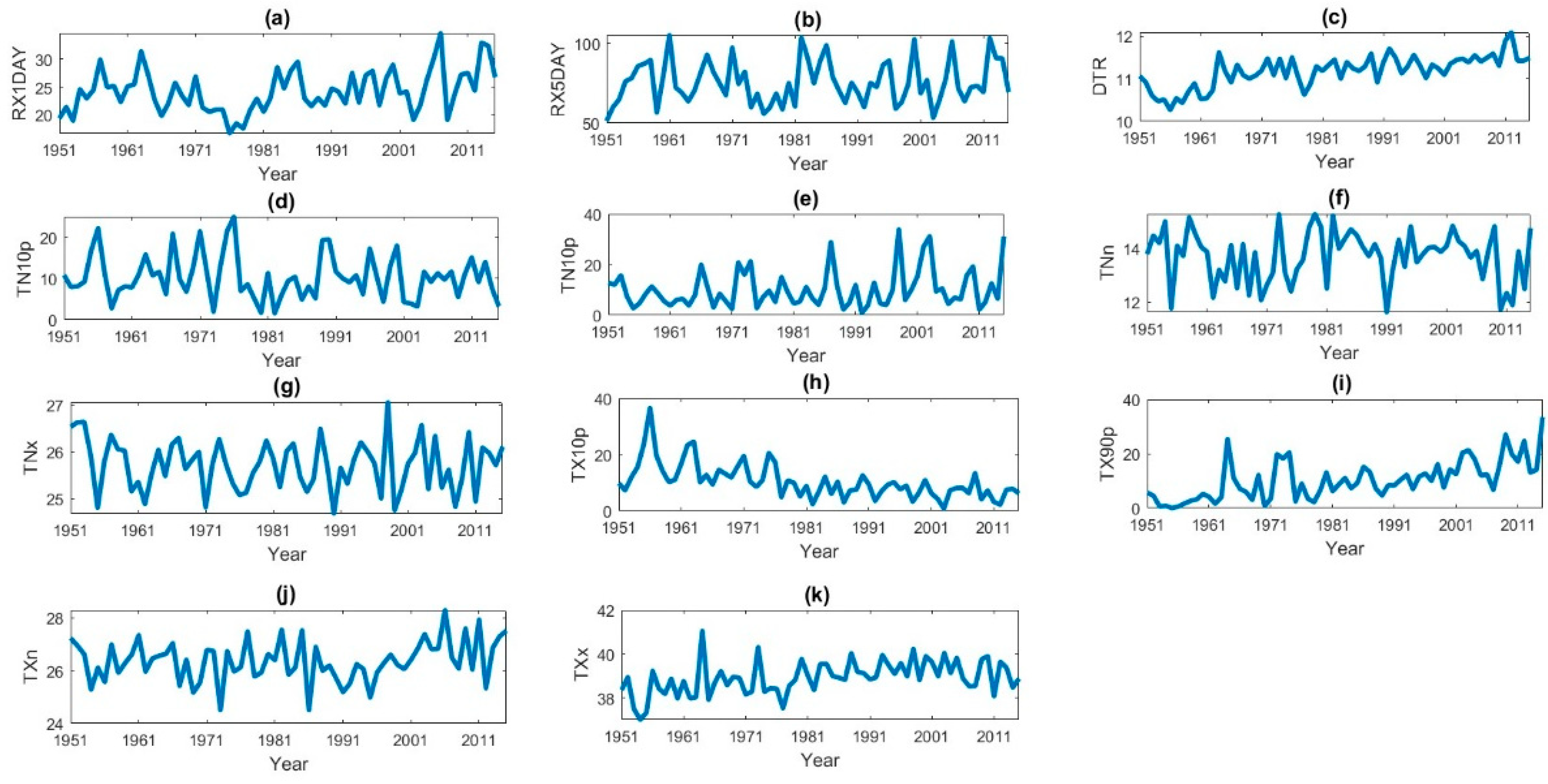 - Zhang, X.; Alexander, L.; Hegerl, G.C.; Jones, P.; Tank, A.K.; Peterson, T.C.; Trewin, B.; Zwiers, F.W. Indices for monitoring changes in extremes based on daily temperature and precipitation data. Wiley Interdiscip. Rev.-Clim. Change 2011, 2, 851–870. [Google Scholar] [CrossRef]