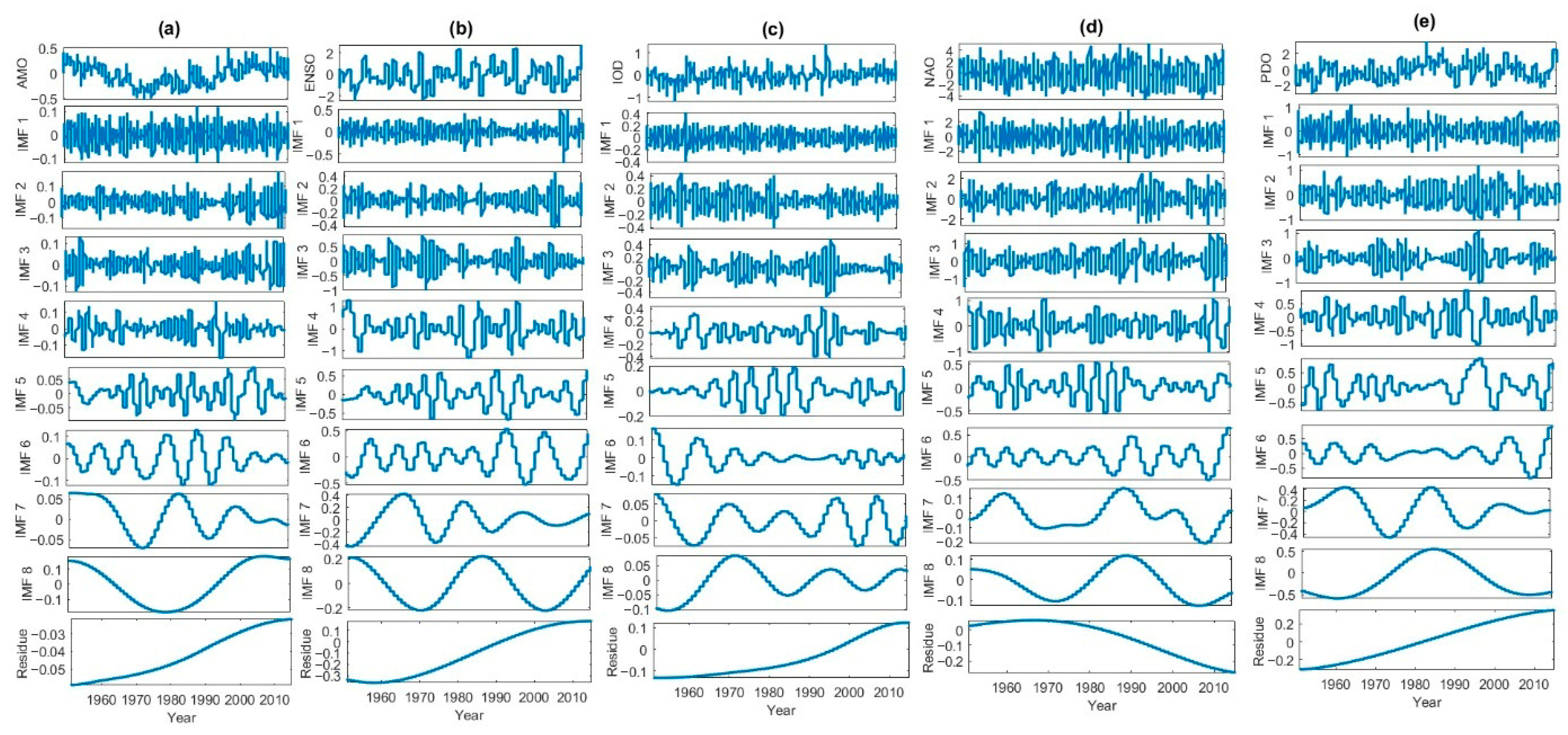 | Index | IMF1 | IMF 2 | IMF 3 | IMF 4 | IMF 5 | IMF 6 | IMF7 | IMF8/ Residue | IMF9/ Residue | IMF 10/ Residue |