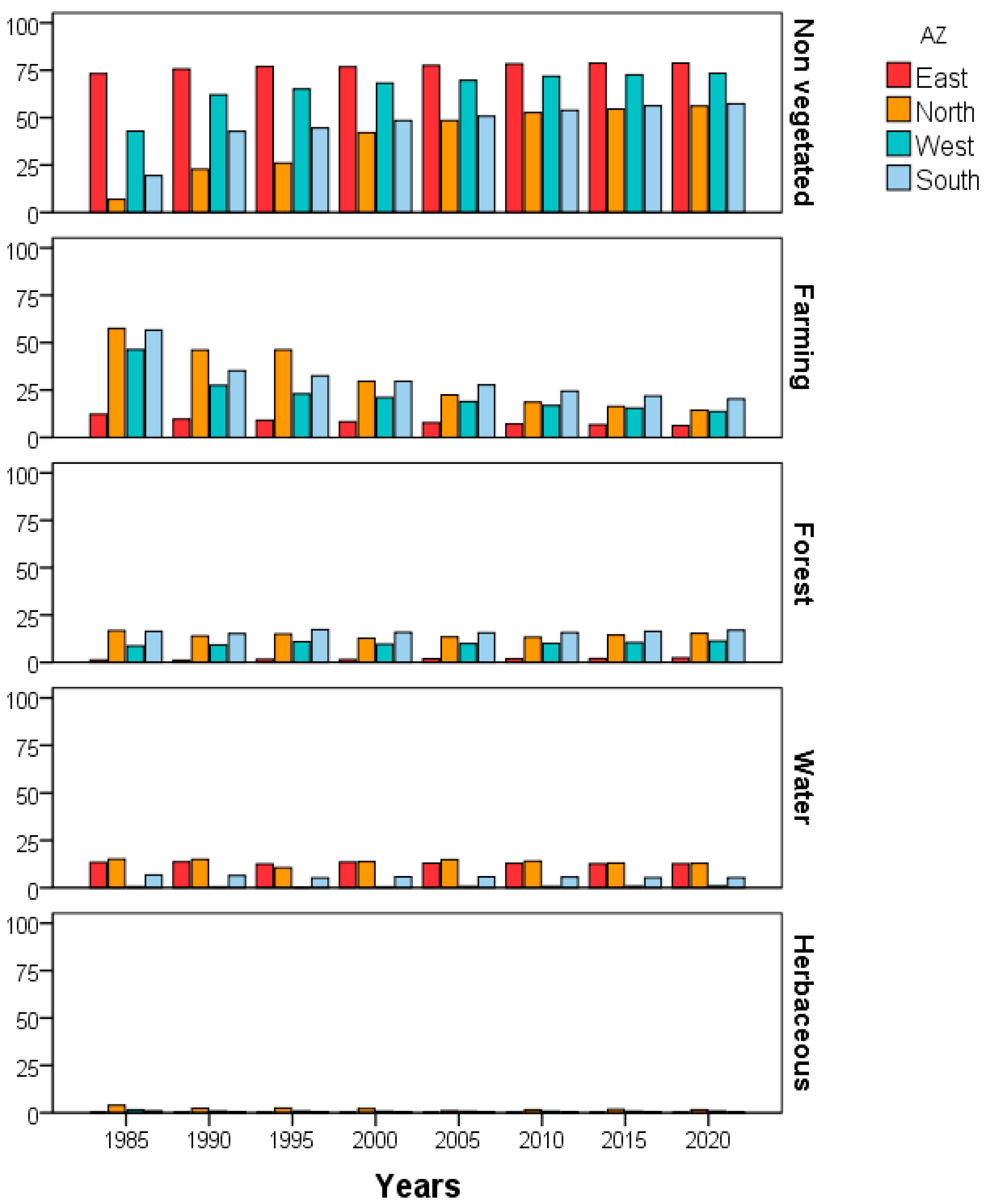 | Ano | Farming | Forest | Herbaceous | Non Vegetated | Water |