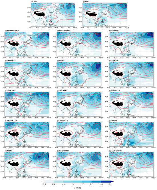 The interannual standard deviations of winter mean 850 hPa meridional winds (shading, units: m s−1) and SLP (contours, units:1 hPa) for the (a) observation, (b) MME and (c–q) the 15 models.