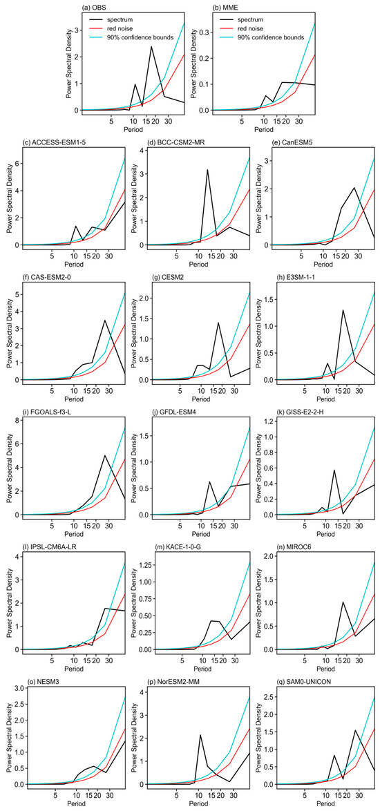 To assess the multi-scale temporal characteristics of the EAWM, we performed a spectral analysis of the EAWM index. As indicated in the bar chart of Figure 3a, the unfiltered spectral analysis reveals a significant interannual signal in the EAWM with a 3–6-year periodicity in observations, the MME and all of the model results. Although results from individual models vary slightly, the interannual signal maybe lined with ENSO remains the dominant component. In addition, the observational results reveal a statistically significant decadal periodicity of 12 years and 20 years (Figure S1a). This peak remains evident even in the spectrum derived from unfiltered data, where pronounced decadal variability coexists with interannual signals, confirming that the identified periodicity is not an artifact of the low-pass filtering procedure. The MME fails to reproduce the decadal variation without the 11-year filter. Only seven models successfully reproduce significant decadal variations with periods longer than ten years, though most exhibit relatively weak power spectral intensity. The power spectrum of 11-year filtered EAWM index is shown in Figure 4. After being 11-year low-filtered, 12 models successfully reproduce the period of approximately 15–20 years except BCC-CSM2-MR, GISS-E2-2-H and NorESM2-MM. Since the historical simulations incorporate both natural and anthropogenic forcings, the robust reproduction of this decadal signal across most models suggests that the EAWM’s low-frequency variability is likely intrinsic to the climate system. This implies that external forcings may modulate rather than fundamentally drive these decadal oscillations—a view further supported by the presence of significant decadal variations in extended pre-industrial control simulations. Additionally, a similar bimodal periodicity is reproduced in four of the fifteen CMIP6 models analyzed, including CAS-ESM2-0, CESM2, E3SM-1-1 and SAM0-UNICON.