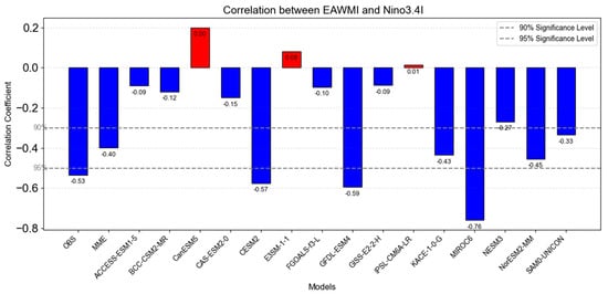Given ENSO’s significant impact on EAWM interannual variability, the ENSO–EAWM relationship is examined in the selected CMIP6 models. The MME-simulated correlation between Niño3.4 index and EAWM index exceeds −0.3, statistically significant at the 90% confidence level. While 12 models simulate the correct negative sign of the ENSO-EAWM relationship, only six of them (CESM2, GFDL-ESM4, KACE-1-0-G, MIROC6, NorESM2-MM, SAM0-UNICON) achieve a statistically significant correlation comparable to observations. Three models (CESM2, GFDL-ESM4, MIROC6) produce a stronger negative correlation than observations, exceeding the 95% significance threshold. The maximum correlation coefficient is −0.74 in 15 models. Asymmetry in the ENSO–EAWM relationship constitutes another key assessment focus. Eight models reproduce distinct EAWM responses to ENSO warm/cold phases successfully, whereas only three models accurately capture the observed stronger impact during El Niño events. In addition, most models underestimate the EAWM weakening during El Niño events complements the work of Guo et al. [22], who identified biases in the zonal SST gradient for the southern mode.