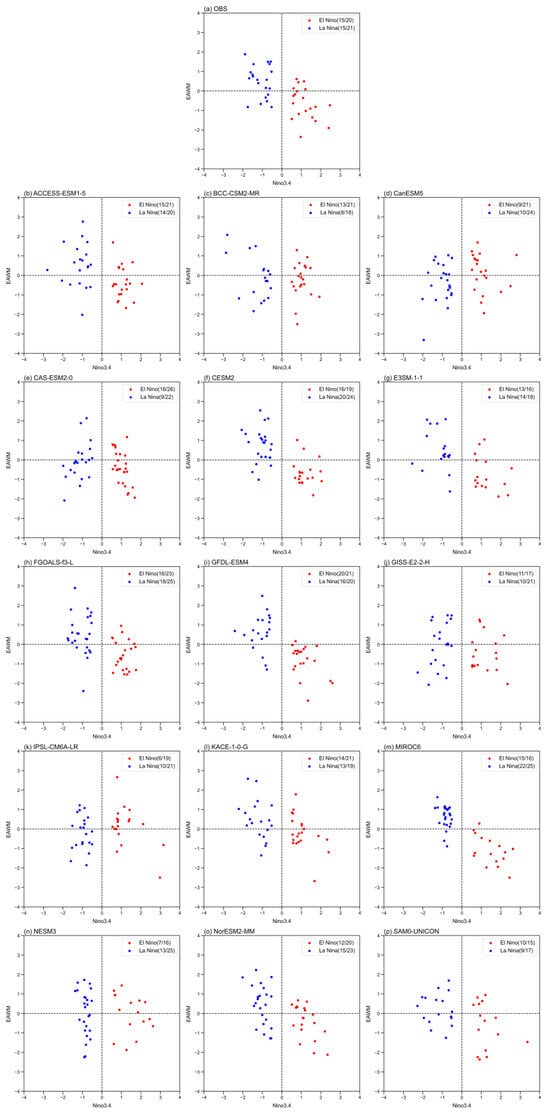 Scatter diagram of DJF-averaged normalized EAWM index against Niño3.4 index for the (a) observation and (b–p) 15 models. The values top-right correspond to the ratios of “El Niño-negative EAWM” events and “La Niña-positive EAWM” events, respectively. In the fraction, the denominator represents the total number of El Niño (La Niña) events, while the numerator indicates the number of concurrent negative (positive) EAWM events that occur simultaneously.