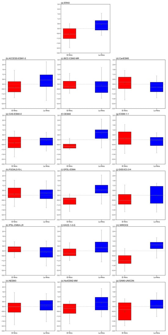 To quantitatively assess the feature, Figure 7 presents boxplots of the EAWM index during canonical El Niño and La Niña events from both ERA5 and the 15 CMIP6 models. Observations confirm this asymmetry: the composite EAWM index averages less than −0.6 during El Niño episodes but +0.5 during La Niña episodes, indicating that El Niño tends to induce a weaker EAWM, while the strengthening effect associated with La Niña is less pronounced. The models’ capability to replicate this observed relationship is limited. Only 8 out of the 15 models (ACCESS-ESM1-5, CESM2, GFDL-ESM4, KACE-1-0-G, MIROC6, NESM3, NorESM2-MM, and SAM0-UNICON) successfully capture the basic “El Niño–negative EAWM/La Niña–positive EAWM” dipole pattern. In contrast to observations, four models simulate a positive mean EAWM during El Niño years, while six models yield a negative mean EAWM during La Niña years. This discrepancy suggests that the more unstable nature of the La Niña–positive EAWM relationship poses a greater challenge for models to simulate accurately. More notably, just three of these models (CESM2, GFDL-ESM4, and MIROC6) with the highest correlation coefficients realistically reproduce the observed amplitude asymmetry between the two phases. A key systematic bias is evident, with over 70% of the models underestimating the magnitude of EAWM weakening during El Niño years. The systematic underestimation likely stems from model biases in simulating the tropical–extratropical teleconnection, ENSO asymmetry and so on, which still requires further verification [21,22].