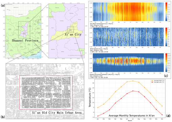 Study area and climate overview. (a) Location of Xi’an within Shaanxi Province and China; (b) extent of the selected high-density urban study area; (c) hourly dry-bulb temperature (°C), wind speed (m/s), and global horizontal radiation (Wh/m2) from the Typical Meteorological Year (EPW), visualized as time–month heatmaps, where warmer colors indicate higher values; (d) average monthly maximum and minimum air temperatures.