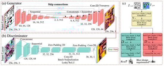Architecture of the pix2pix model. (a) Generator network based on a U-Net architecture with encoder–decoder structure and skip connections, where feature maps from the encoder are concatenated with corresponding decoder layers to preserve spatial details. (b) PatchGAN discriminator architecture, which classifies local image patches as real or fake to enforce high-frequency realism. (c) Detailed structure of the discriminator blocks, illustrating convolutional layers, batch normalization, activation functions, and the final decision layers. Different colors indicate different functional modules (e.g., convolutional blocks, normalization layers, and activation layers), dashed boxes denote network components or stages, and arrows indicate the data flow during forward propagation.
